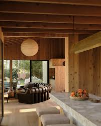 The living room is the heart of the home, boasting a hearth made of travertine and a wall of glass that frames a breathtaking view of the surrounding pine forest. The furniture is low‑profile and built from walnut, emphasizing a warm, natural aesthetic. A key design element highlighted is the “sky‑roof”—a frosted glass panel that diffuses natural light while preserving privacy. The article includes a link to an interview with the interior designer, which elaborates on how the sky‑roof was engineered to resist snow loads and maintain structural integrity.
